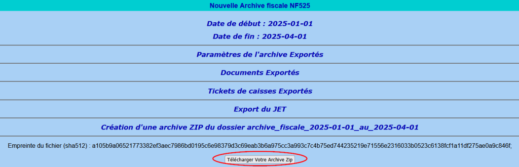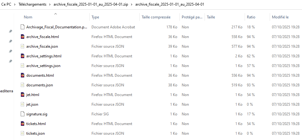 Pour information le fichier ZIP obtenu contient un lot de fichiers au format PDF, HTML et JSON, ainsi qu’une signature électronique (fichier .sig), compatibles avec la norme NF525 :
