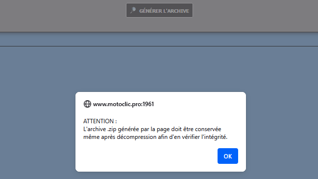 Une notification rappelle qu’il faut conserver le fichier .ZIP obtenu. Cliquer sur « Ok » :