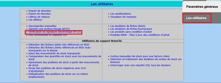 « Paramètres » -> « Utilitaires » -> « Vérification de signature électronique NF525 »