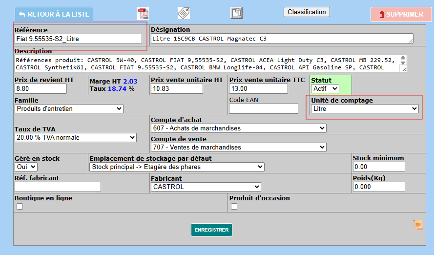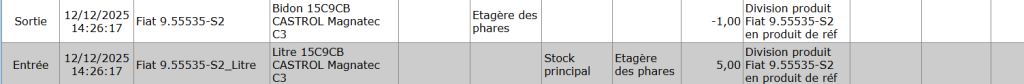 Nous allons ensuite sélectionner notre bidon en produit source et la fiche produit du litre que nous venons de créer en produit de destination.