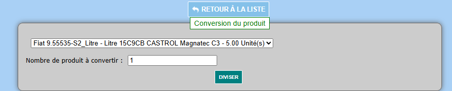 En cliquant dessus, nous pouvons définir, parmi les conversions définies précédemment, le produit en lequel nous voulons diviser notre produit source, ainsi que le nombre de produits à convertir.