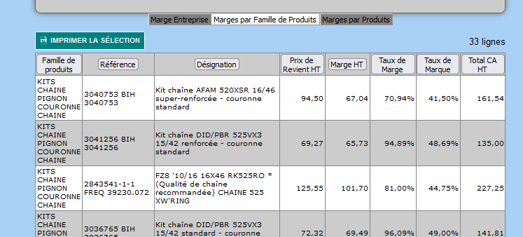 En cliquant sur une famille en particulier, on peut accéder au détail des marges par produits pour la famille concernée:
