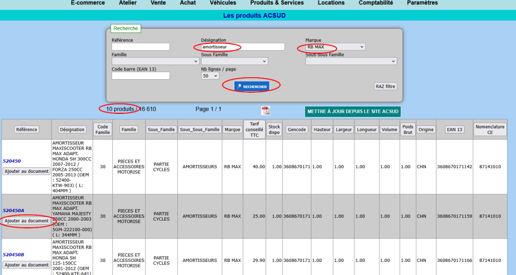Lorsqu’on clique dessus, on peut chercher parmi les 16.000 références de ACSUD le produit à ajouter à la Facture (ou au Devis, etc…) selon la référence, la désignation, etc… Exemple, je cherche un amortisseur de la marque « RB MAX » :