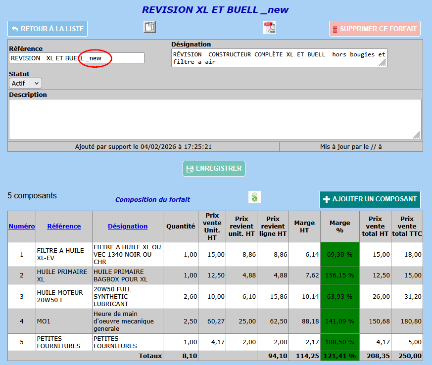 Le système va alors créer un nouveau forfait identique, avec « _new » à la fin de la référence. Il ne vous restera qu’à adapter la référence, la désignation, la description et les composants selon vos besoins :