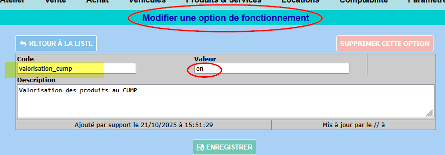 Pour activer ce mode de valorisation, allez dans « Paramètres » -> « Paramètres généraux » -> « Options de fonctionnement » et sur l’option « valorisation_cump« , passez la valeur à « on« :