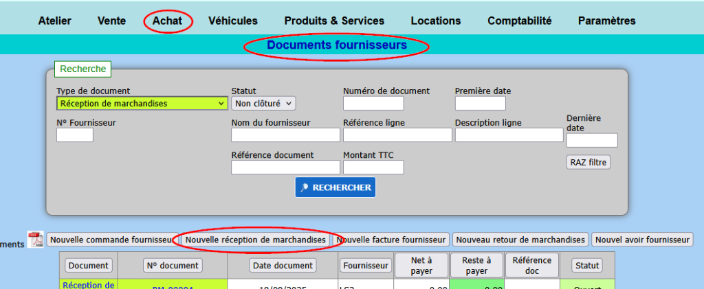 Pour calculer le CUMP, le système a besoin que vous lui indiquiez les quantités réceptionnées et les prix d’achats correspondants. Pour cela utilisez les « Réceptions de marchandises » dans le module « Achat »: